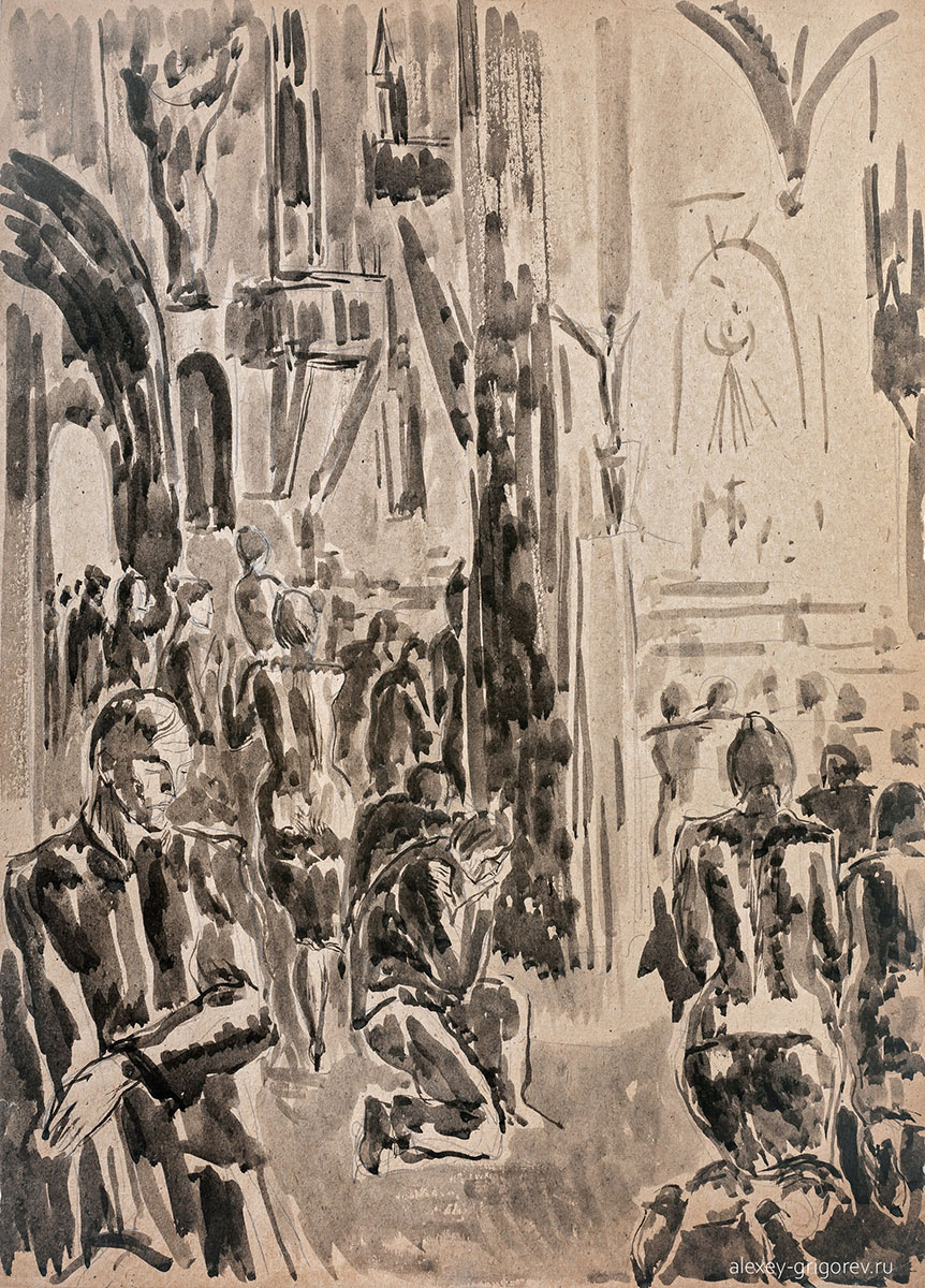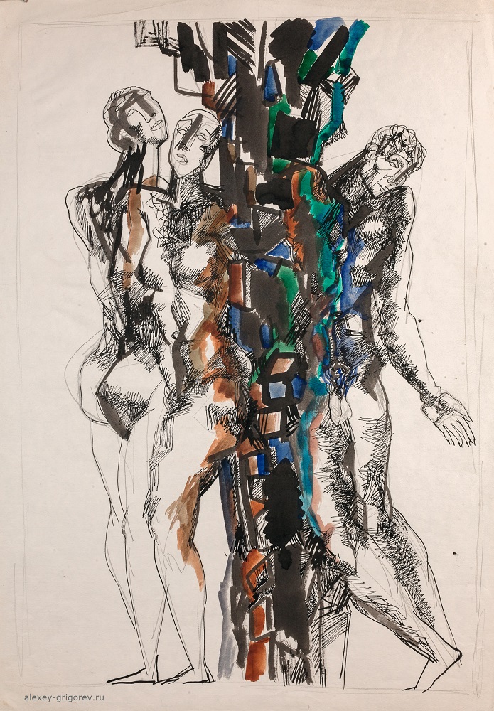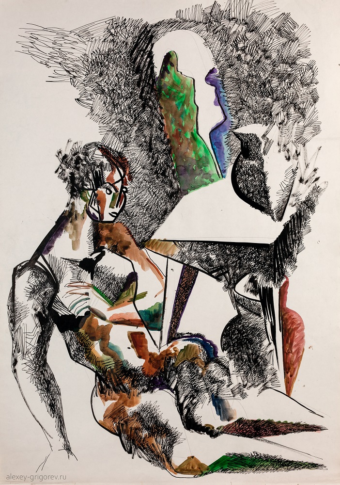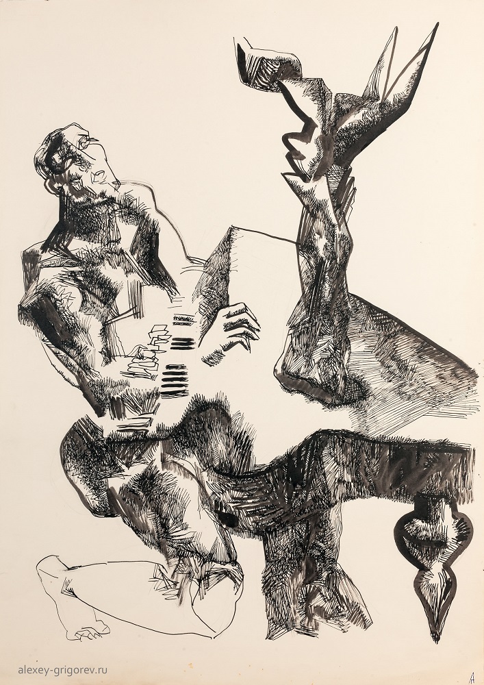 В экспозиции будет представлено около 40 графических работ скульптора Алексея Григорьева (1949-2002), выполненных тушью, периода 1990-2000-х годов. Сами работы Алексея будут сопровождены стихами Надежды Григорьевой.