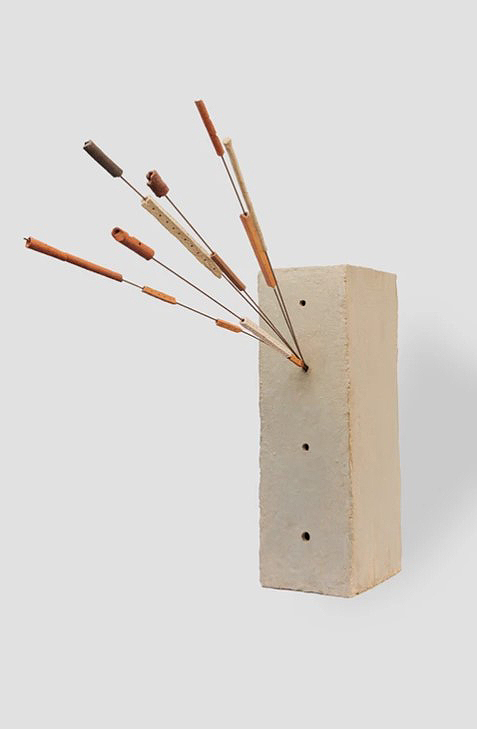 Отдельного внимания заслуживает обширный набор материалов, с которыми умеет работать Кирилл, как более легких в применении, так и менее податливых. Это картон, из которого изготовлены макеты; гипс, дерево, бетон, бронза и другие металлы. Интересно, что, помимо традиционных приемов, технологии, применяемые к одним материалам, Кирилл виртуозно переносит на работу с другими. Например, технику перфорация камня, исполнение которой можно увидеть в деревянных объектах, пронизанных отверстиями.